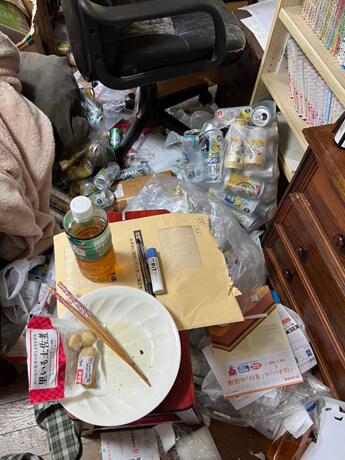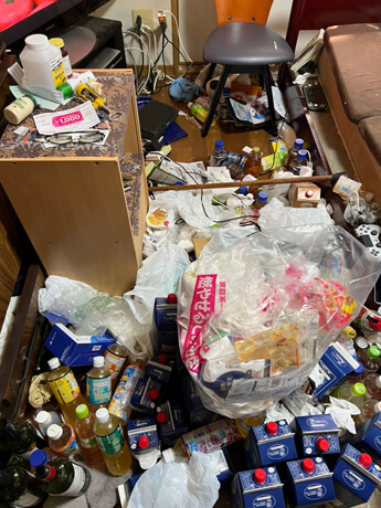 今回は仕事の都合で急遽引越しが決まったものの部屋の中は床一面にゴミが散乱しており、ビン・缶・ペットボトルもそのまま放置され足の踏み場もない状態でした。「ゴミの分別が面倒・処分方法が分からない・引っ越しまでの時間がない」ことから、自分では片付けられないとお困りになりご依頼をいただきました。